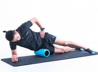 1. Lie on your side with the hard foam roller under your outer thigh, supporting your upper body with your forearm.